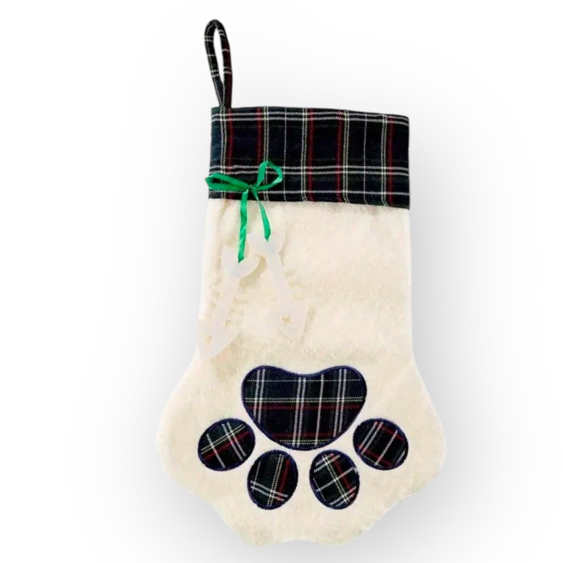Don't fur-get to include your kitty in the festivities this Christmas. This green tartan stocking is an adorable paw-shape with fish cut-outs attached by green ribbon. Personalisation is included! If you would like a particular type of font, please send us a message after placing your order.