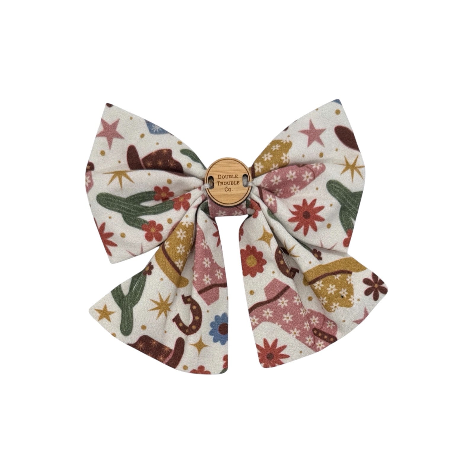Saddle up in style with our 'Boot Scootin' Bow', a crisp white bow featuring cute cowboy boots, cacti, horseshoes and flowers in pink, mustard, and green tones.