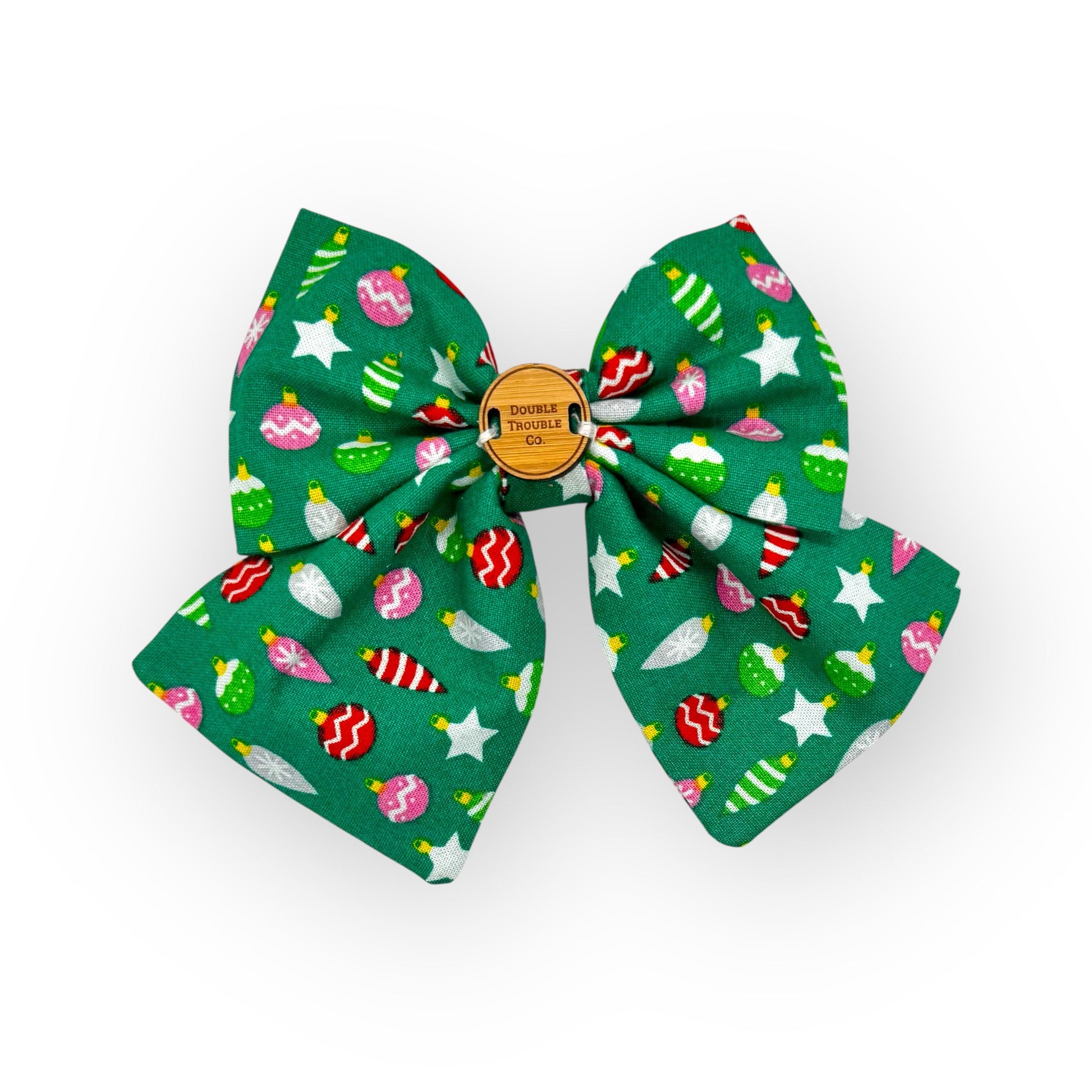 Get your fur friend ready for the holidays with 'Deck the Paws!' This sailor bow features a festive Christmas ornament design on a bold green background.