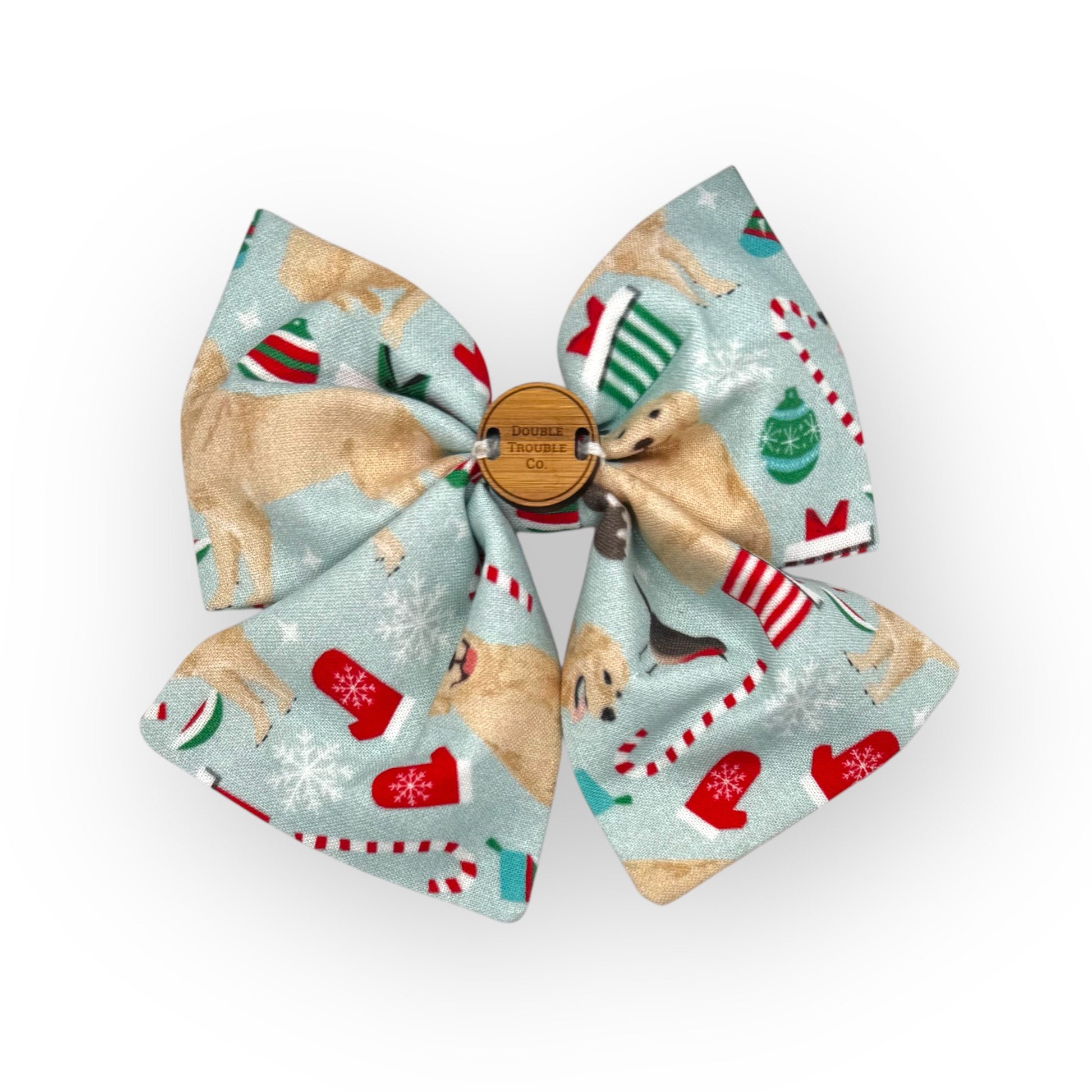 Fetch the pawfect holiday look with Gifts Are Golden - a golden retriever's dream come true! This Sailor Bow is sure to bring a smile with its festive presents, stockings, and candy cane design on a light blue background.