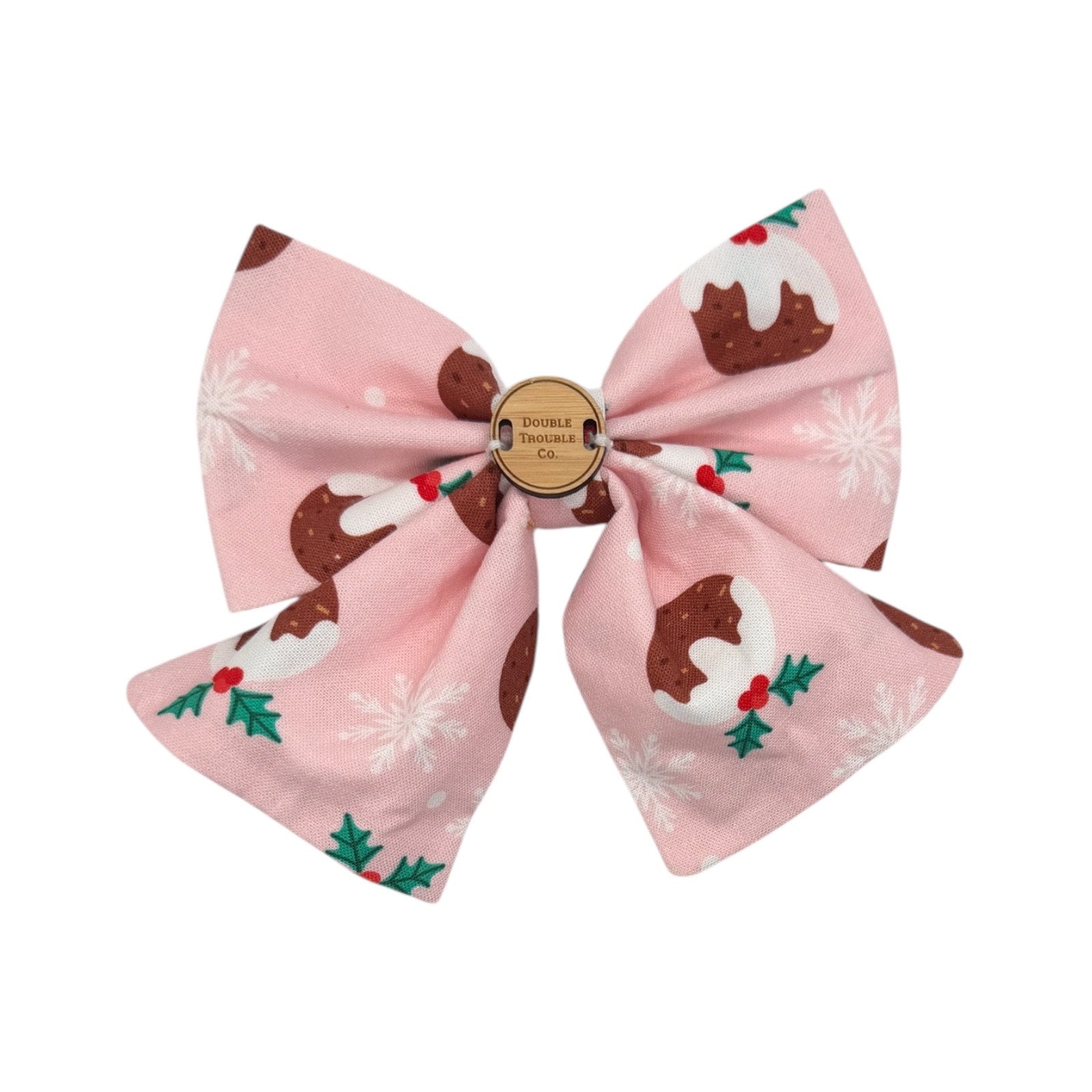 'Hi Puddin'' is a cute and festive sailor bow featuring classic Christmas puddings on a sweet pink background.