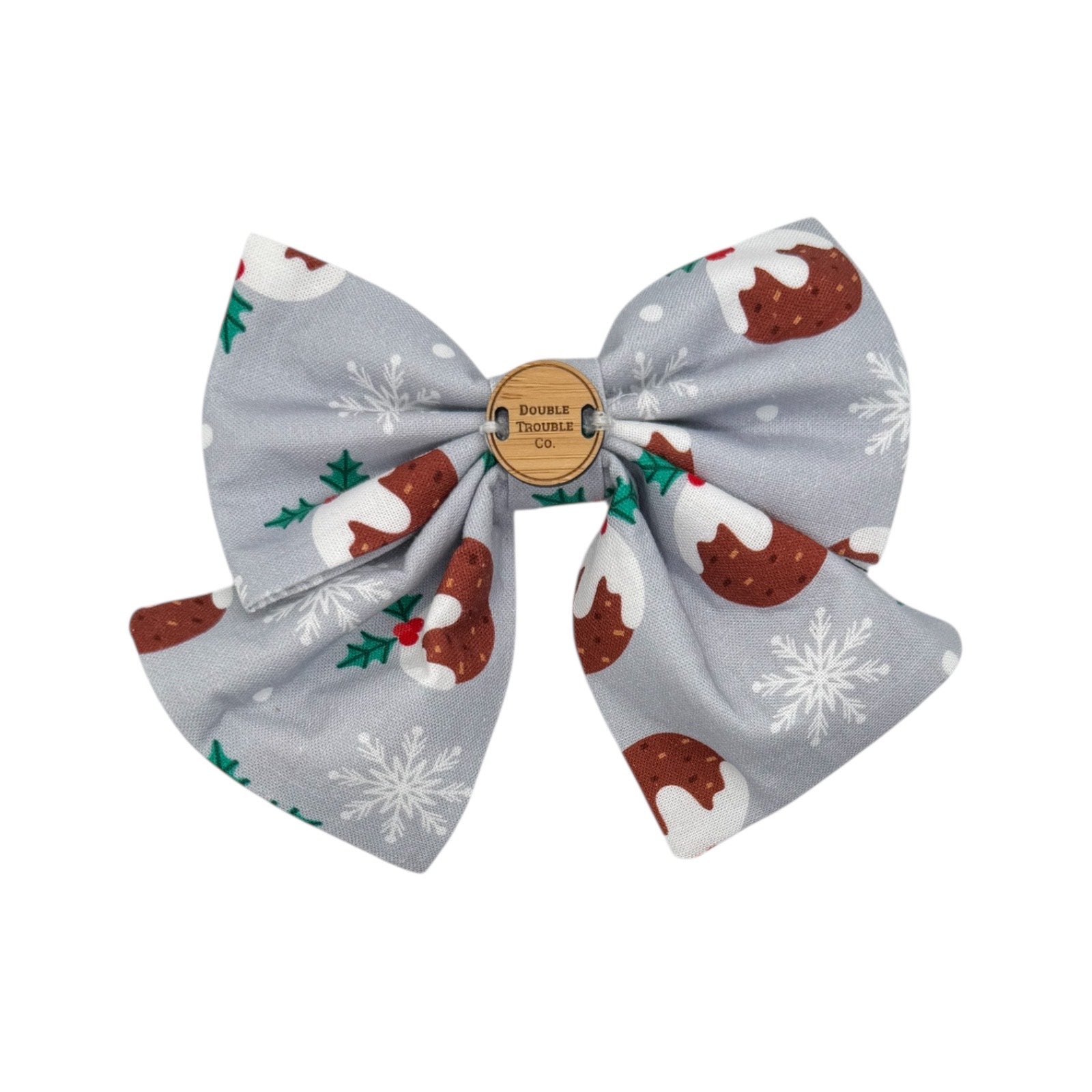 'Hi Puddin'' is a cute and festive sailor bow featuring classic Christmas puddings on a sweet silver background.