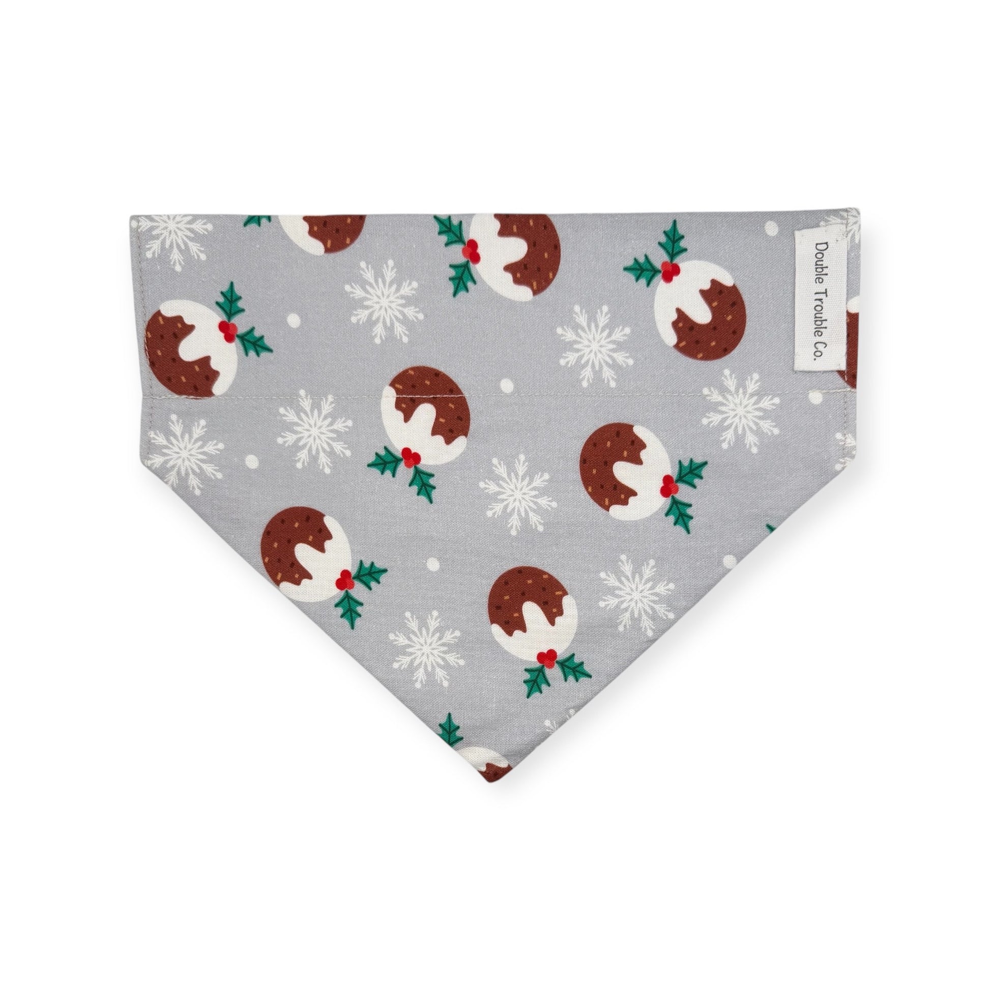 'Hi Puddin'' is a cute and festive bandana featuring classic Christmas puddings on a stunning silver background.