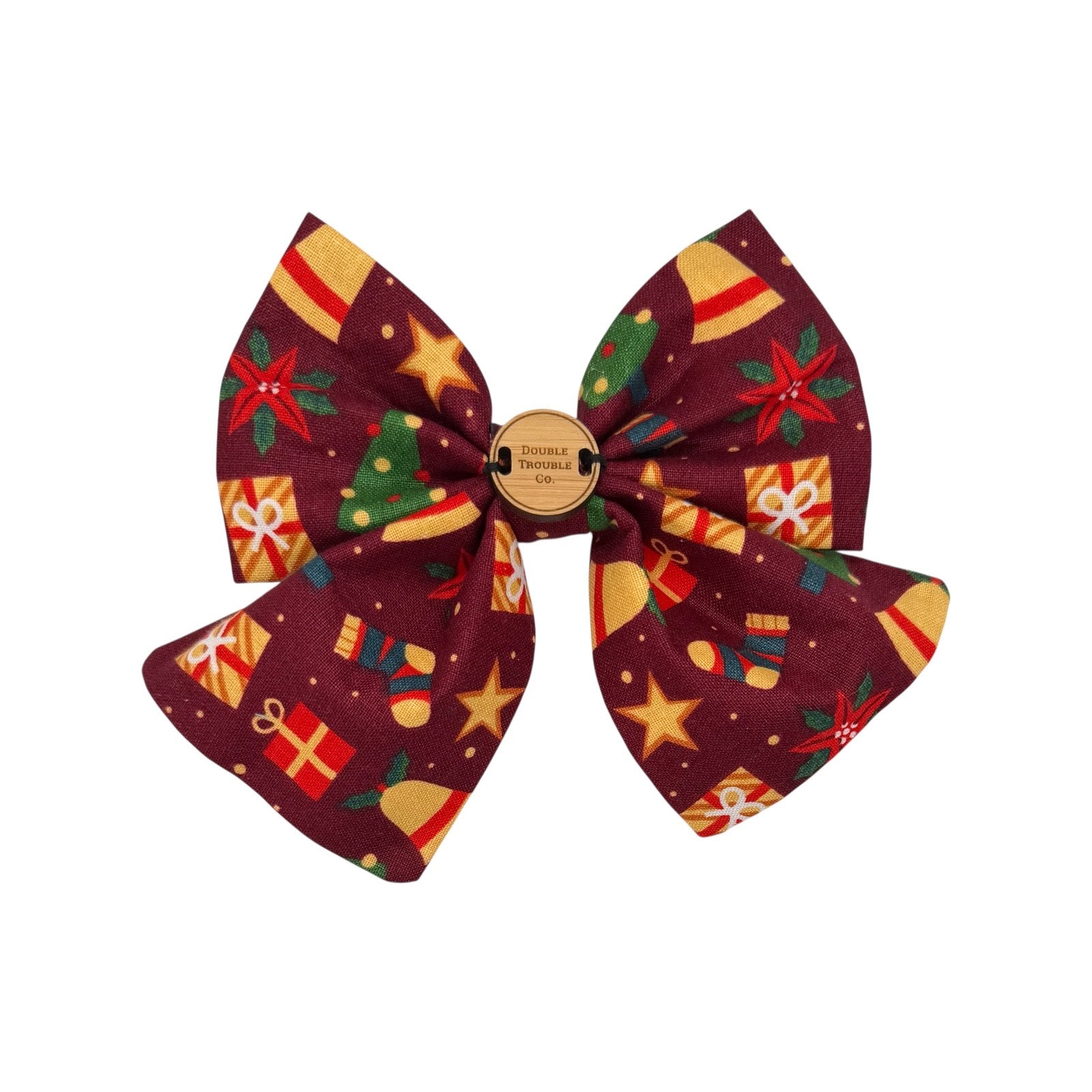 Crimson bow-tie with festive Christmas trees, presents, and stockings.