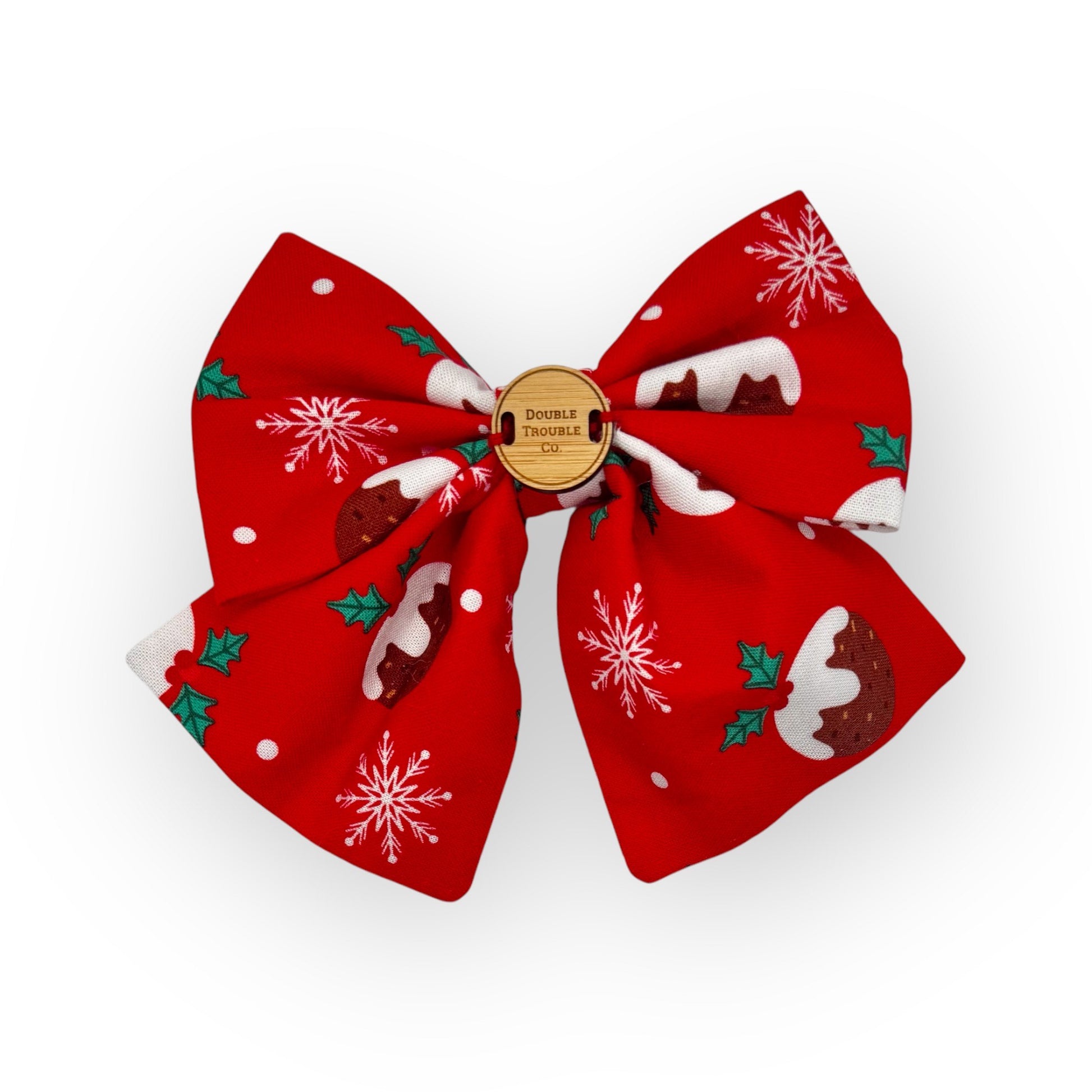 'Pudding Pups' are ready for the holiday paw-ty! This cute sailor bow features Christmas puddings on a rich red background.