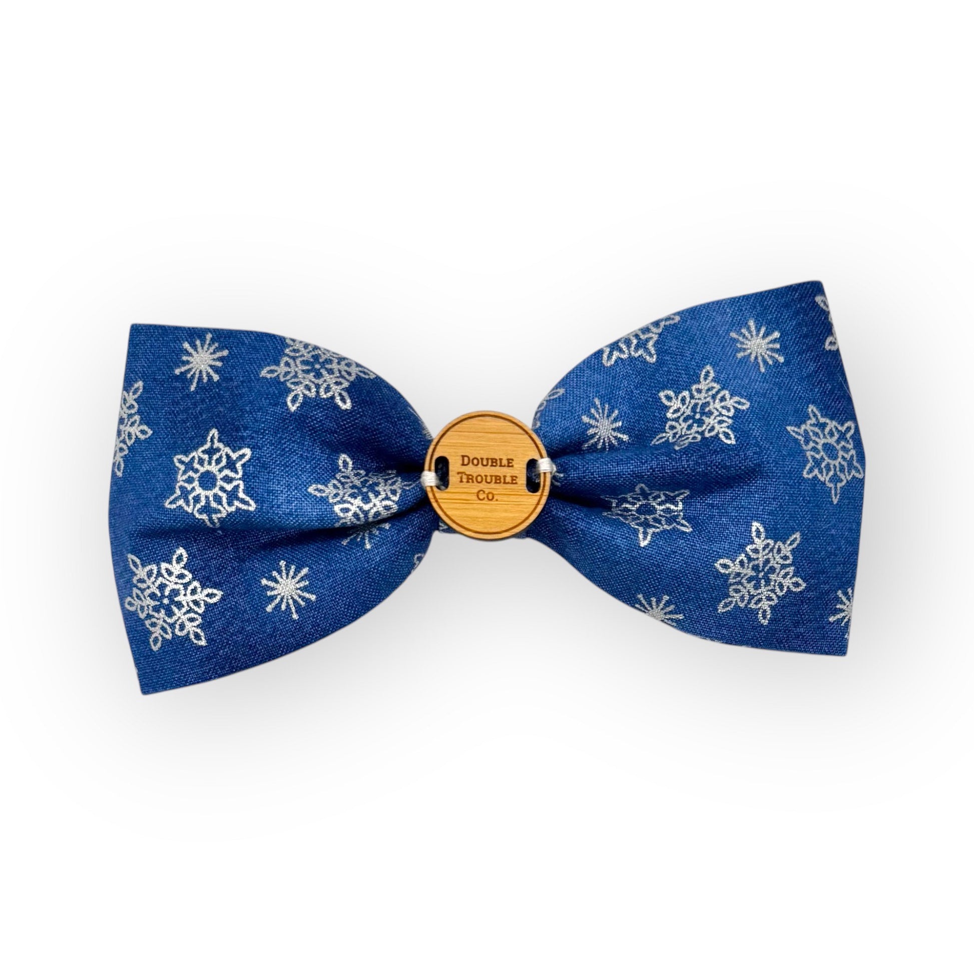 Flake it until you make it! Dress your pup or cat in style with our 'Silver Snowflakes' bow-tie! This beautiful bow-tie features shimmering silver snowflakes on a bright blue background.